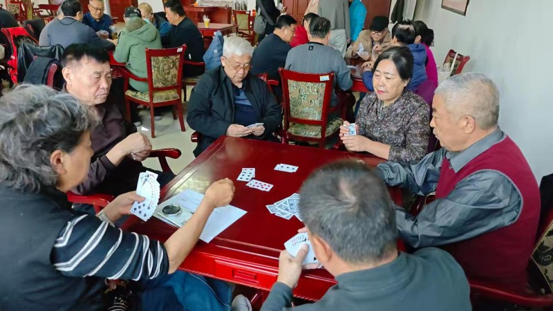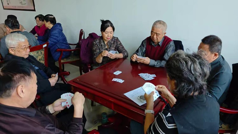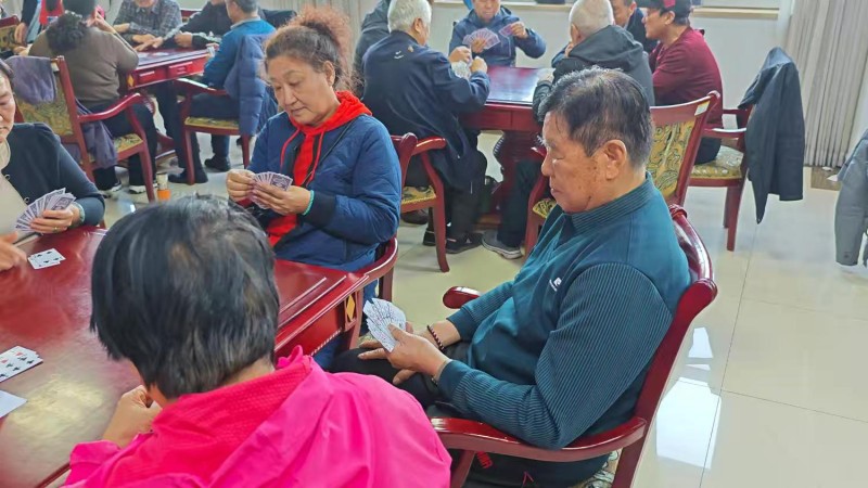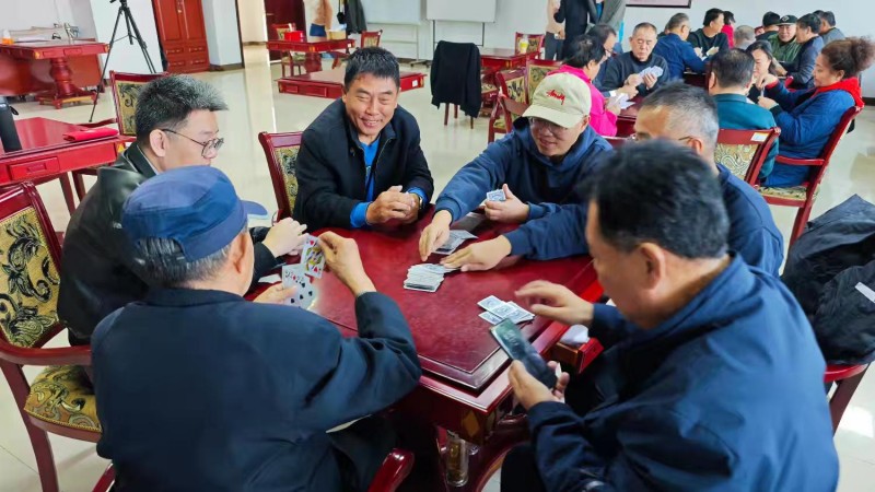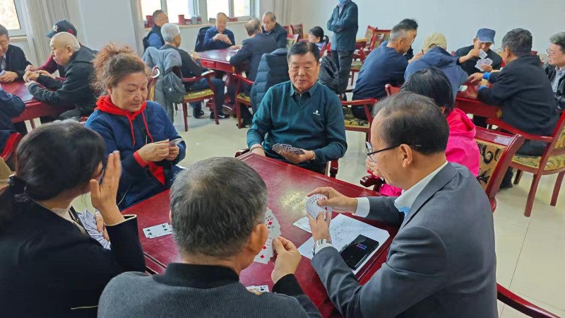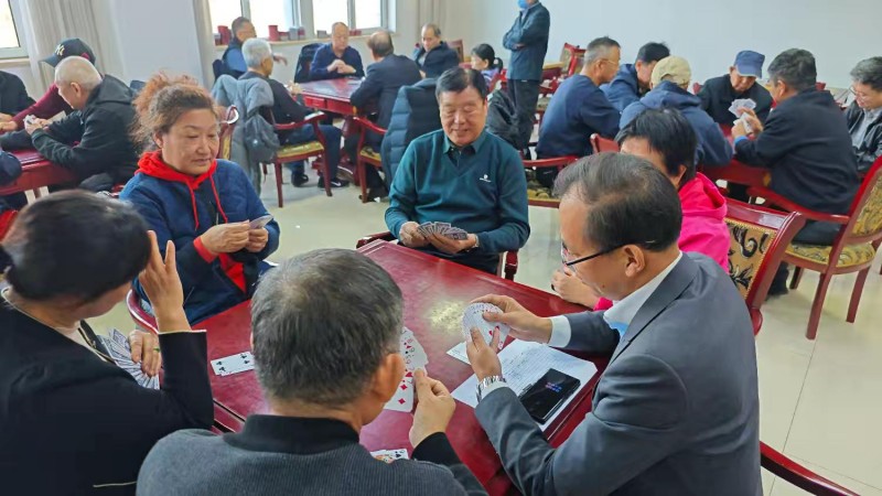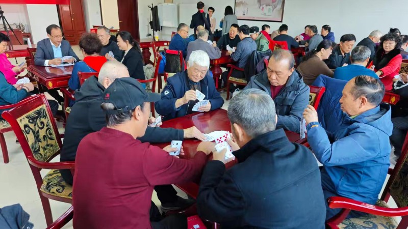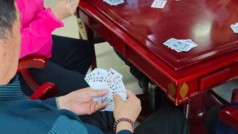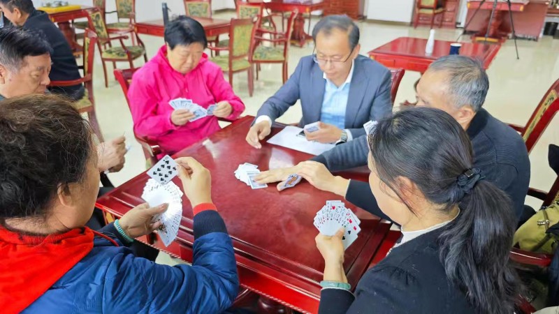 棋牌厅内瞬间热闹起来,却又井然有序。每一张牌桌前,老同志们围坐一堂,神情专注、沉着冷静,时而凝神思索、审慎出牌,时而低声交流、默契配合,时而会心一笑、从容应对。手中的扑克牌在他们指尖灵活流转,每一次出牌、每一次叫牌、每一次配合,都展现出老同志们精湛的牌技与敏锐的思维;每一场对决、每一次比拼,都充满了乐趣与温情,没有激烈的争执,只有友好的切磋,没有输赢的计较,只有相聚的欢愉。